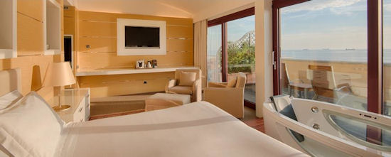 The NH Livorno Grand Hotel Palazzo is a unique 5 stars-location in front of the waterfront Terrazza Mascagni walkway protruding out of the Ligurian Sea. This 19th –century hotel is fringed with a beautiful garden, a grand lobby and a fabulous sea-front terrace with bar, restaurant and hydromassage pool. The hotel has 123 rooms, all elegantly dressed in a refined style: many of them include splashes of blue to tie in with the sea. It is also equipped with a spa with sauna and Jacuzzis, an indoor swimming pool and 24-hours gym. There are 5 function rooms with high ceilings and natural daylight flooding through the windows and a rooftop restaurant.